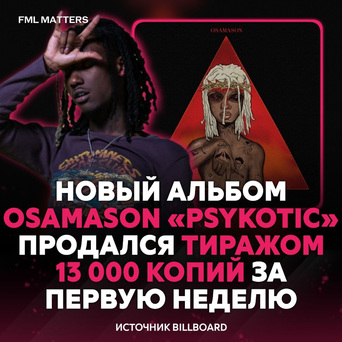 📈 OSAMASON — ИТОГОВЫЕ ПРОДАЖИ АЛЬБОМА «PSYKOTIC»! Альбом продался тиражом 13 000 копий за первую неделю и дебютировал на #81 в чарте Billboard 200. Это самый высокий результат в его карьере на данный момент. Достойный результат? ❤️🔥 / 👎 💀 FML MATTERS