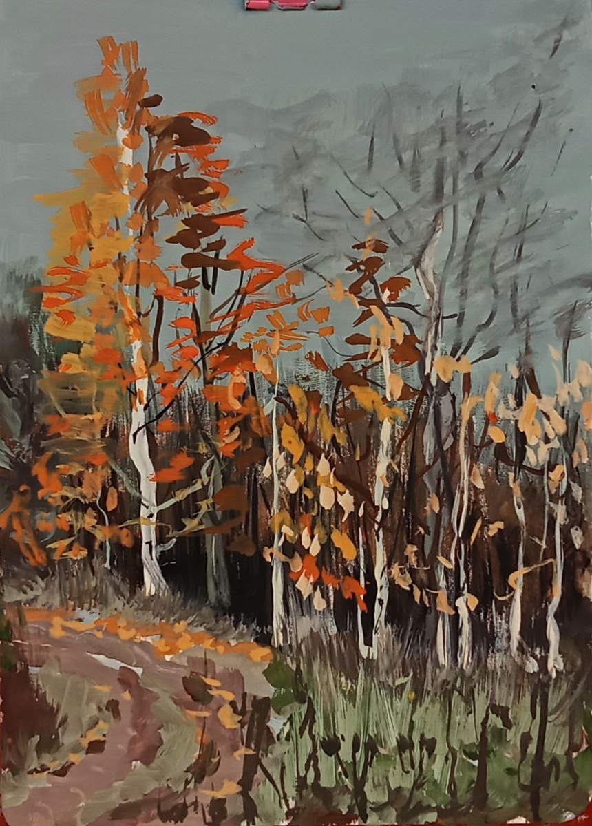 Осенний этюд Картон, гуашь #осень #этюд #живопись
