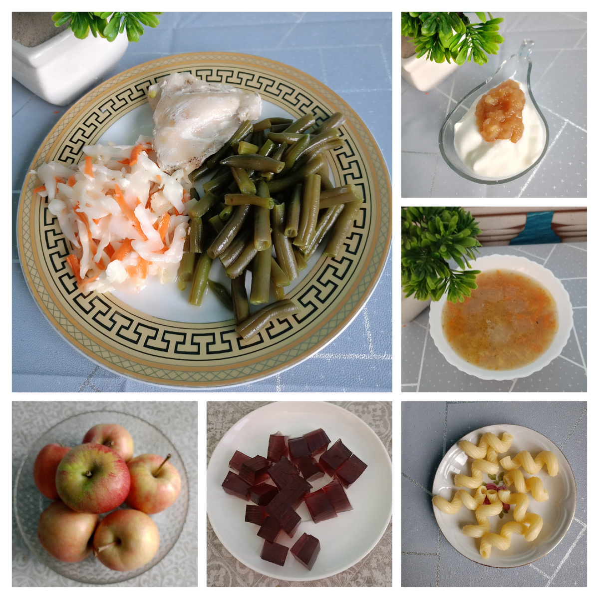 • Завтрак - куриная грудка на пару; стручковая фасоль на пару; квашеная капуста; мацони с яблочным пюре.