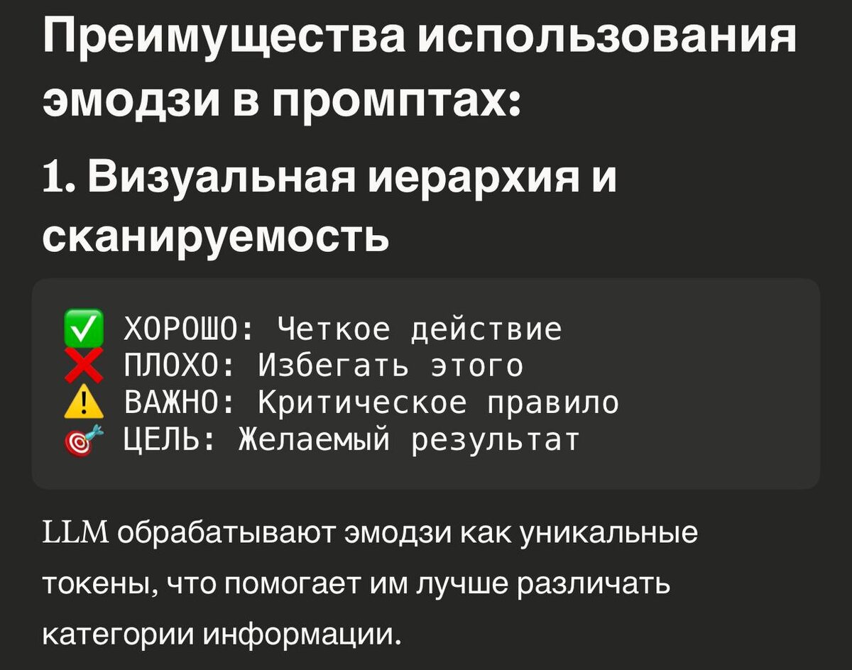 Понимает ли ИИ эмодзи в промтах и инструкциях? Пишу инструкцию для сценариста и смотрю, что при корректировках мне ИИ помощник выдает примеры как делать и как не делать с помощью ❌✅ Examples: ❌ "Learn about prostate health" ✅ "Five exercises that restore erection firmness in fourteen days" ✅"Simple protocol that eliminates prostatitis pain without antibiotics" Ок. Выглядит мне визуально понятно. А в итоге то ИИ это поймёт? Claude сказал, что да. Это сокращает количество используемых токенов и отлично считывается. ✅ = положительный пример ❌ = отрицательный пример ⚠️ = предупреждение 🚨 = критическое правило 💡 = совет/идея 📝 = заметка/правило Пробуем применять в своих промтах и инструкциях и делимся результатом 👌