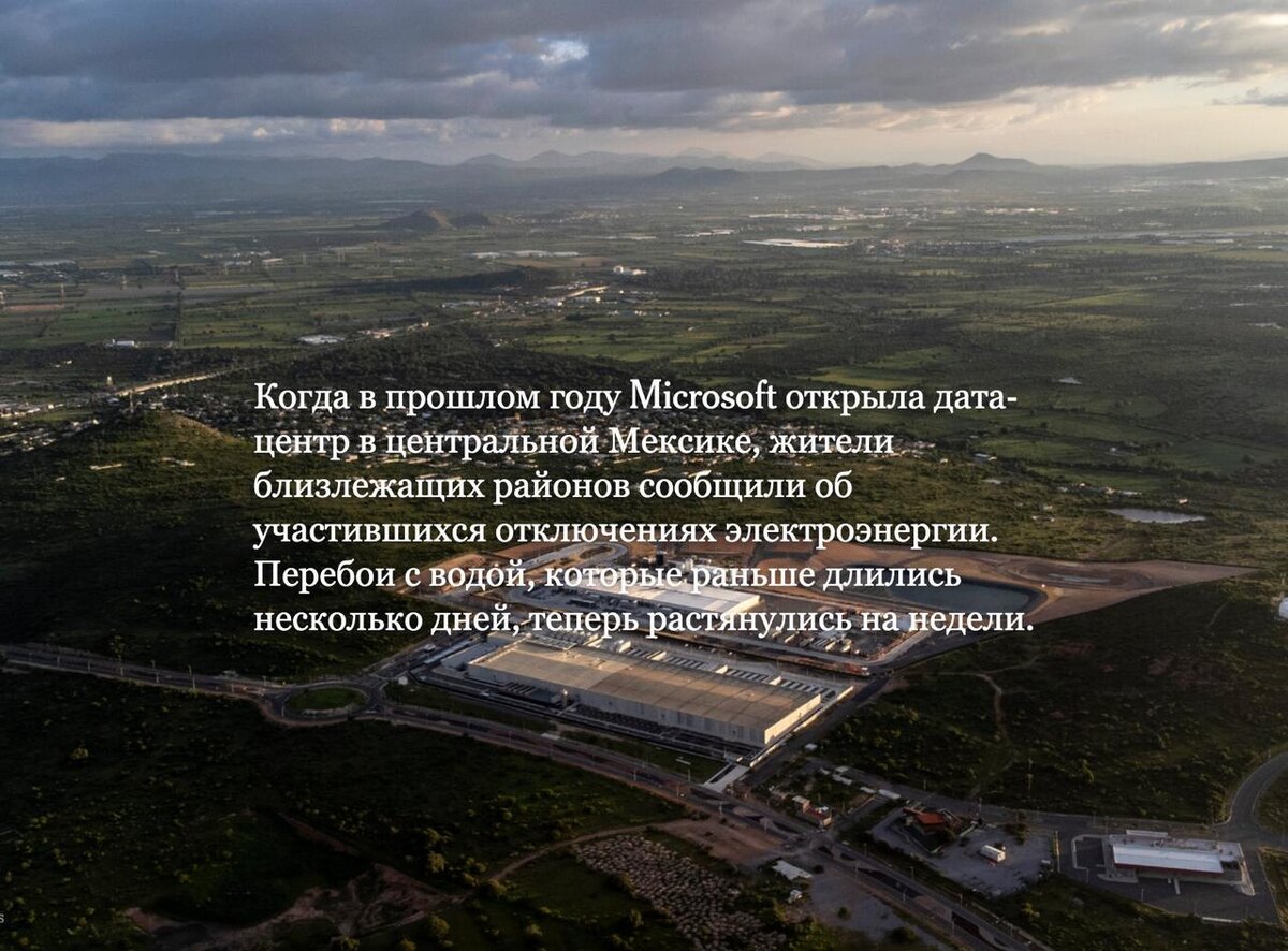 ЦОДы вызывают водный и энергетический кризисы, пишет New York Times По словам Алехандро Стерлинга, директора по промышленному развитию региона, в центральной Мексике возникли проблемы с электросетевой инфраструктурой, что привело к отключениям электроэнергии. По данным Synergy Research Group, изучающей эту отрасль, по всему миру разрабатывается не менее 575 проектов центров обработки данных В Ирландии дата-центры потребляют более 20% электроэнергии страны. Власти ограничили строительство новых дата-центров в районе Дублина из-за «значительного риска» для электроснабжения. Ранее писали, что сельское население Техаса выступает против строительства ЦОДов из-за усугубления водного кризиса. В Чили водоносные горизонты находятся под угрозой истощения. В Южной Африке дата-центры создают допнагрузку на проблемную национальную электросеть. Аналогичные опасения возникли в Бразилии, Великобритании, Индии, Малайзии, Нидерландах, Сингапуре и Испании. Технологические компании часто строят цен