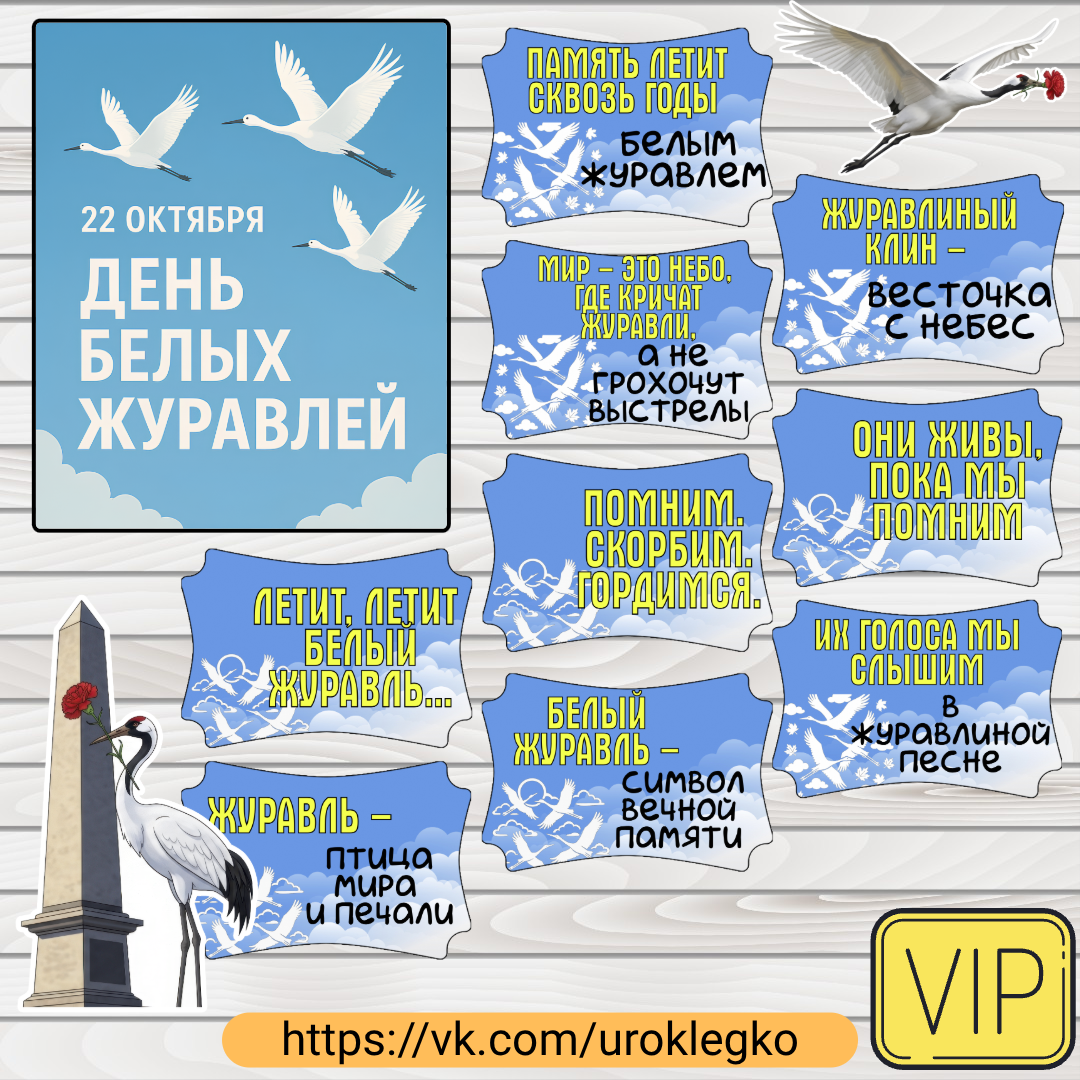 Оформление на тему «День белых журавлей» (22 октября) понадобится для того, чтобы создать в школе торжественную и памятную атмосферу, которая поможет ученикам осмыслить важность этого дня — дня памяти павших во всех войнах. С помощью плаката, собираемого из листов А4, можно эффектно оформить стенд или холл, привлекая внимание масштабной визуализацией. Тематические фразы на отдельных листах послужат глубокими смысловыми акцентами, раскрывающими символику журавлей как душ солдат, а дополнительные иллюстрации усилят эмоциональное восприятие, сделав выставку наглядной и целостной, что способствует воспитанию патриотизма и уважения к истории. Где можно скачать: https://vk.com/uroklegko