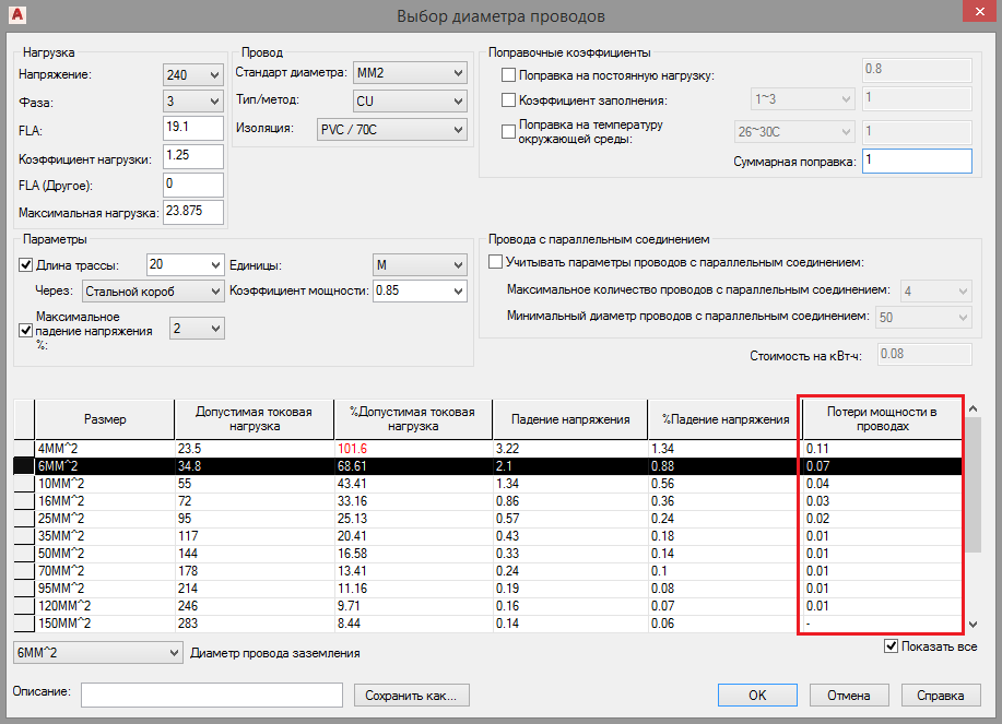 Рассмотрим методику расчета потерь в проводах на примере трехфазной цепи двигателя. Для выбранных параметров нагрузки, характеристик проводов и параметров трассы сформировалась таблица проводов, содержащая 6 столбцов: «Размер», «Допустимая токовая нагрузка», «%Допустимая токовая нагрузка», «Падение напряжения», «%Падение напряжения» и «Потери мощности в проводах». Для трехфазной цепи Потери мощности в проводах рассчитывается по формуле: 1.732 х падение напряжения х (FLA + FLA (Другое) / 1000. Для сечения проводов 6 ММ2: 1.732 х 2.1 х (19.1 + 0) / 1000 = 0.07 Для однофазной цепи Потери мощности в проводах рассчитывается по формуле: падение напряжения х (FLA + FLA (Другое) / 1000. Для сечения проводов 6 ММ2: 2.42 х (19.1 + 0) / 1000 = 0.05 Оценка потерь в проводах Для постоянной нагрузки можно получить информацию о максимальной стоимости в год потерь в проводах. Если в разделе «Поправочные коэффициенты» активизировать опцию Поправка на постоянную нагрузку, то в таблице проводов отобрази