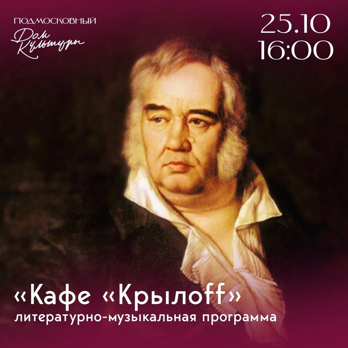 ✨ «Попрыгунья Стрекоза Лето красное пропела, Оглянуться не успела, Как зима катит в глаза!» Вот и у нас, как в известной басне Крылова, уже давно наступила осень. Самое время окунуться в атмосферу творчества русского писателя Ивана Андреевича Крылова. ➡️ Ждём вас 25 октября в 16:00 на литературно-музыкальной программе «Кафе Крылоff». Вход свободный 🤗 📆 25.10.2025🕒16:00 🏢 Подмосковный сельский дом культуры (СДК) 📍 г.о.Домодедово, пос.санатория Подмосковье, д.9 💰 Вход свободный❗️ ✅ Мероприятия Домодедово https://dzen.ru/id/66f10385cc4c5a16f7b5fb02 http://vk.com/domodedovo_events http://dzen.ru/domodedovo_events