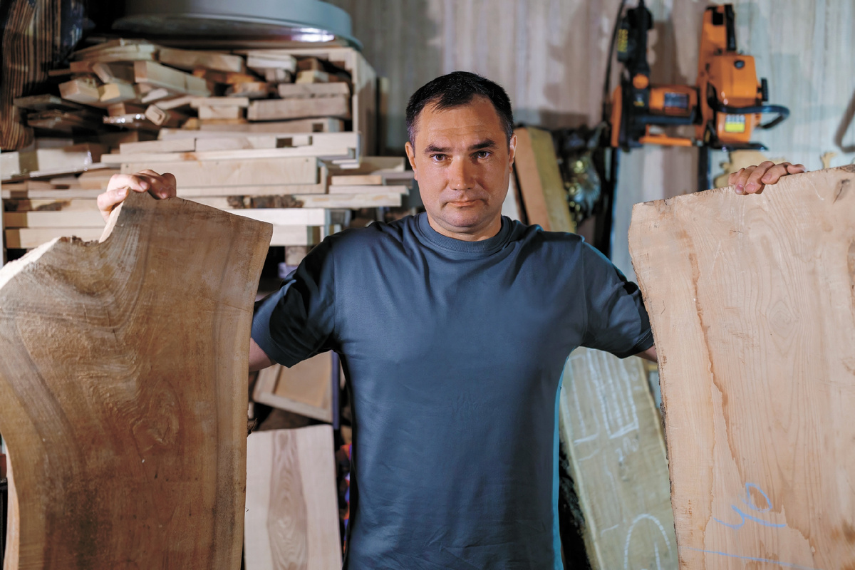 Запах древесины, шум распила, лязг инструментов. В своей мастерской он превращает доски и поленья в стильные предметы интерьера и не только. Глубина, глянец, застывший холст – для этого необходимо добавить вязкую субстанцию, и вуаля... Нет, не так просто. Чтобы получить это самое «вуаля», нужно как следует покорпеть. Усердно, основательно.
