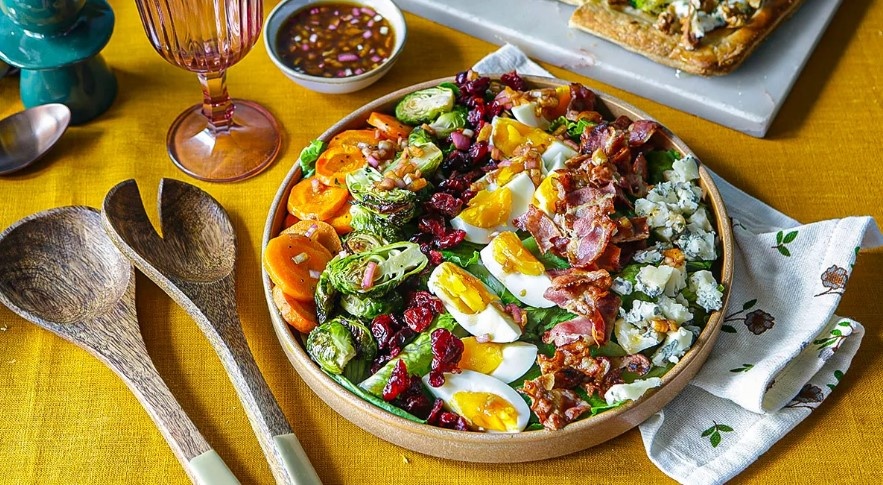 Начнем с чего-то легкого, но эффектного. Однажды я решила удивить гостей, и получился салат с брюссельской капустой, яйцом, беконом и клюквой. Сервировка – настоящая живописная картина: яркие оранжевые кружки моркови, зеленые листья салата романо, красная клюква и золотистый бекон.