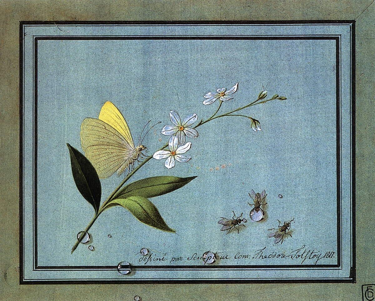 Помимо цветных обманок, Толстой виртуозно работал в технике гризайли. Это когда акварель создается одной краской, но разной по тону: от светлой, почти водой, до темной, насыщенной пигментом. Он создавал имитации барельефов из серого камня или гипса. Используя лишь оттенки серого, он достигал полной иллюзии объема, света и тени, заставляя плоский лист бумаги «прочитываться» как скульптурное произведение.