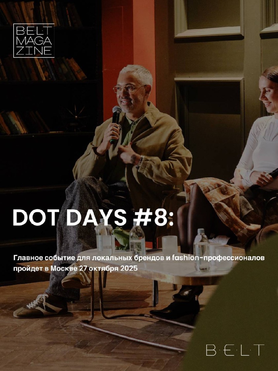 РЕКОМЕНДАЦИЯ НЕДЕЛИ ОТ BELT 27 октября в галерее White Хохловка пройдет восьмой Dot Days — главное событие для локальных брендов, экспертов и всех, кто живет модой, созданное агентством Dot Comms. На одной площадке соберутся дизайнеры, журналисты, инфлюенсеры, байеры и представители ритейла. Что вас ждет? В течение дня будут проходить презентации fashion и lifestyle брендов, знакомства, нетворкинг и деловая программа от Dot Talks с ведущими спикерами индустрии. За четыре года Dot Days объединил 190+ брендов и более 300 профессионалов. Восьмой сезон обещает быть самым масштабным — открытый формат, больше гостей, больше энергии и больше моды. Когда: 27 октября 2025 Где: галерея White Хохловка, Хохловский пер., 7-9с11, Москва Рекомендуем не пропускать это мероприятие! Наша команда тоже там будет, присоединяйтесь! *Приобрести билеты на мероприятие, а также ознакомиться со всеми подробностями программы можно на официальном сайте Dot Comms.