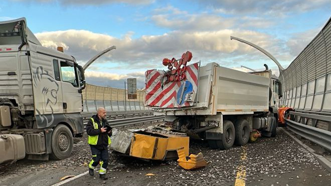 По словам автора видео, груженый щебнем КАМАЗ на полном ходу врезался в дорожную технику. Еще немного - и ударил бы легковой автомобиль на аварийках, но затормозил об ограждение и остановился буквально в полуметре.