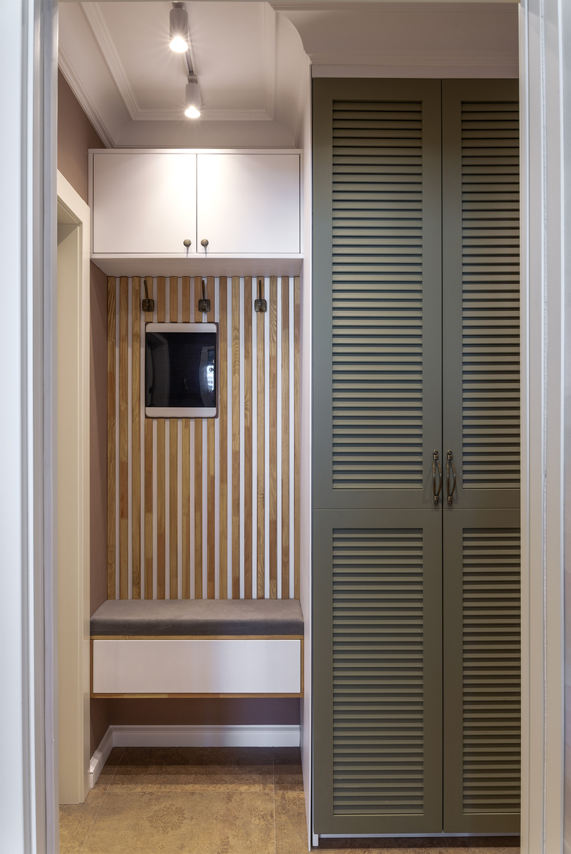 Что такое визуализация- помимо того, что это фотореалистичный образ вашего будущего интерьера, это еще и обещание. Обещание сделать мечту реальностью. Визуализация-это не просто цвет стен, мебели, это в первую очередь атмосфера, это то пространство для жизни, в котором будет комфортно жить заказчику. И главная магия начинается там, где картинка задуманная совпадает с реальностью. В этом проекте прихожая получилась именно такой, как и была задумана на 3д визуализациях. Теплый, «вкусный» оттенок стен, продуманная геометрия линий, вертикаль вытягивает невысокие потолки, горизонтальные линии немного расширяют узкое пространство прихожей. Белый оттенок в элементах систем хранения приобретает теплый оттенок, как бы впитывает тепло от деревянных элементов. Напольная плитка общая в зоне кухни и прихожей, такой обволакивающий цвет молочного шоколада. Изначально на визуализациях плитка, выбранная на совместном выезде.Она напоминала полы в интерьерах, которые выполнены в средиземноморском стил