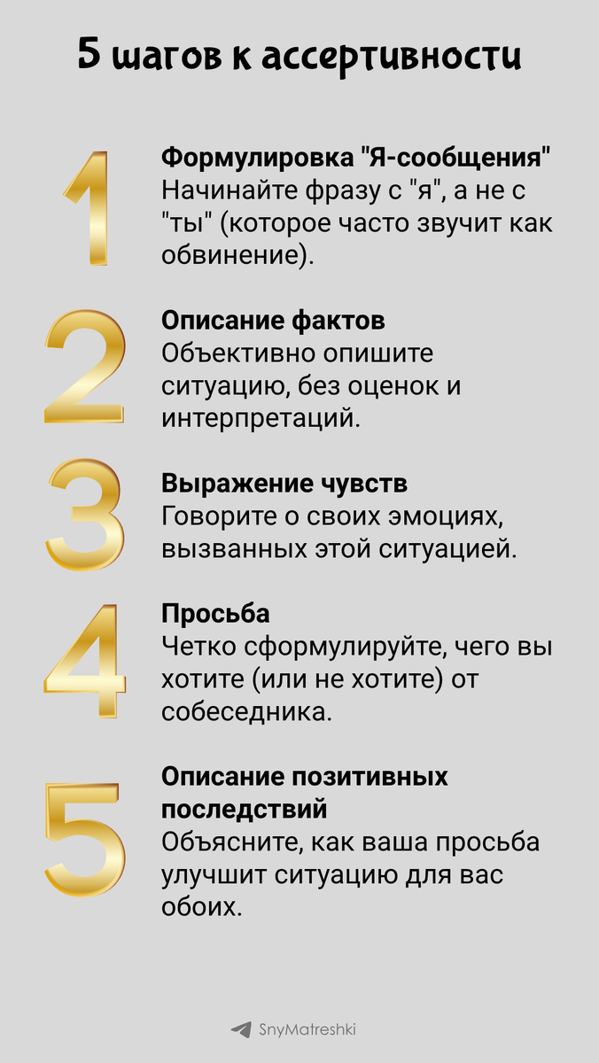Формула четкого, уверенного и уважительного выражения своих потребностей и границ. Ассертивность — это навык, который оттачивается, как мускулатура. В предстоящей простой ситуации потренируйтесь использовать формулу "Я-сообщения". Поддержать автора Александра Бóгдан,