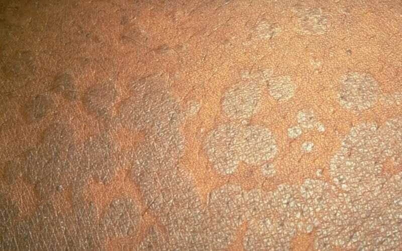 Псориаз. Как и указано выше - не заразен. Неизлечим. Можно лишь приглушить внешние проявления. Чаще поражает кожу, но встречаются поражения ногтей и суставов. Выглядит как красныe, чрезмерно сухиe, приподнятые над поверхностью кожи пятна, сливающиеся между собой и образующие бляшки. Красный цвет обусловлен образованием новых мелких кровеносных сосудов. Чаще течёт волнообразно – ремиссия-обострение. Степень тяжести варьируется от единичных крохотных бляшек, до поражения бОльшей части тела. С течением времени обычно прогрессирует. Псориаз ухудшает качество жизни больных. В зависимости от площади поражения пациент испытывает как физический, так и психологический дискомфорт. Зуд или боль могут мешать выполнять повседневные функции. Бляшки на голове, ошибочно принимаемые окружающими за перхоть, грозят даже социофобией. Лечение проходит несколько этапов, различающихся уровнями риска. Самолечение может быть опасно. Рекомендуется обращаться к дерматологу в КВД.