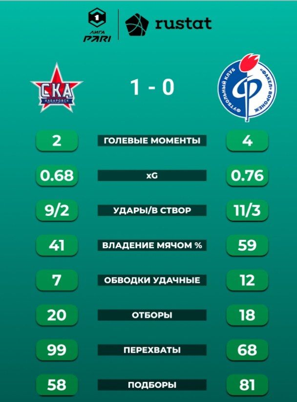 СКА-Хабаровск-Факел 1-0 прогноз 0-2. Гол: Брагин, 29 (1:0); Факел: Фролкин (в), Журавлёв, Магкеев, Черов, Альшин (Габараев, 90+), Моцпан (Уридия, 77), Нетфуллин (к), Багателия (Симонов, 46), Гиоргобиани, Гонгадзе, Белайди (Ковалёв, 90+). Предупреждения: Багиев, 4; Магкеев, 47; Брагин, 70; Мастерной, 90+. Судья: Новиков Никита. 2342.