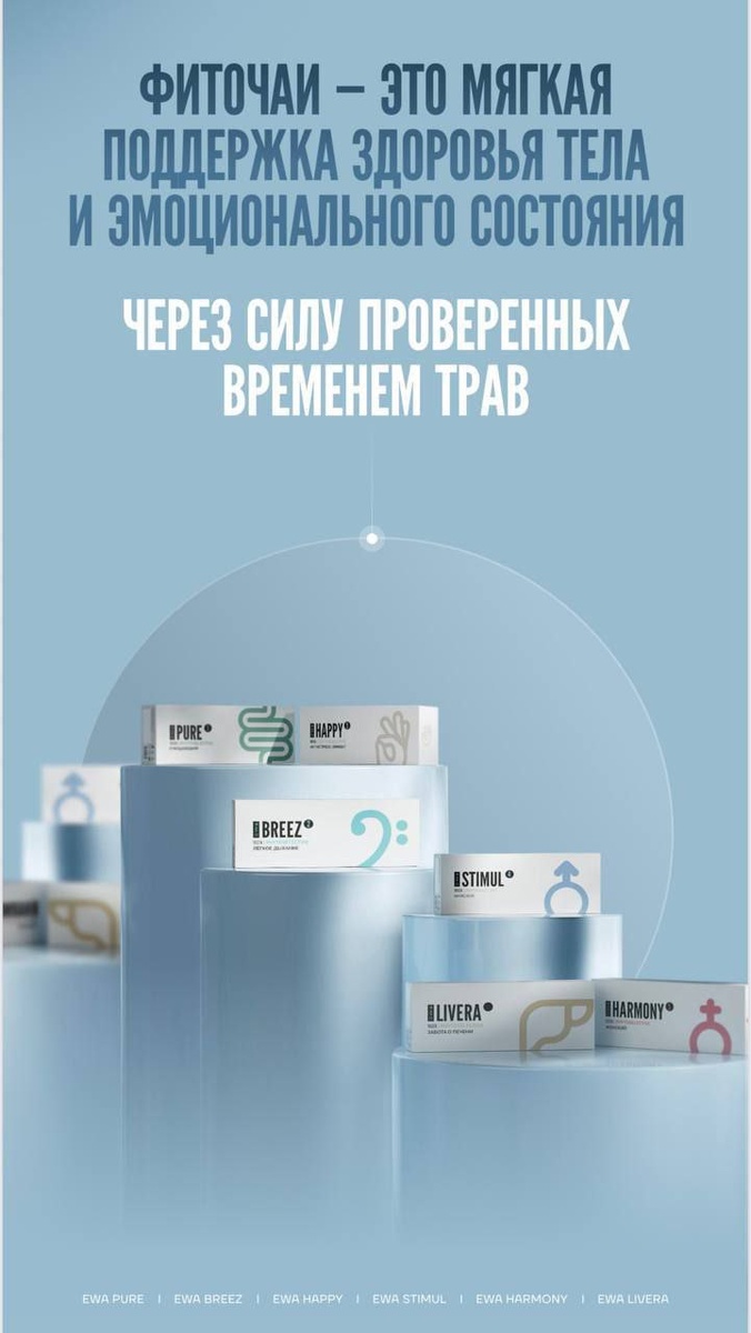 Фиточайочки подъехали. Фиточаи EWA — это 6 направлений для комплексной поддержки организма: 🍃EWA BREEZ — для свободного дыхания 🍃EWA HAPPY — антистресс-эффект 🍃EWA HARMONY — для женской гармонии 🍃EWA LIVERA — для защиты печени 🍃EWA PURE — для мягкого очищения организма 🍃EWA STIMUL — для мужской силы Самое главное — это не просто «травки из аптеки». в EWA всё сделано по принципу: максимум пользы без рисков Попробуй. Почувствуй. Восстановись.
