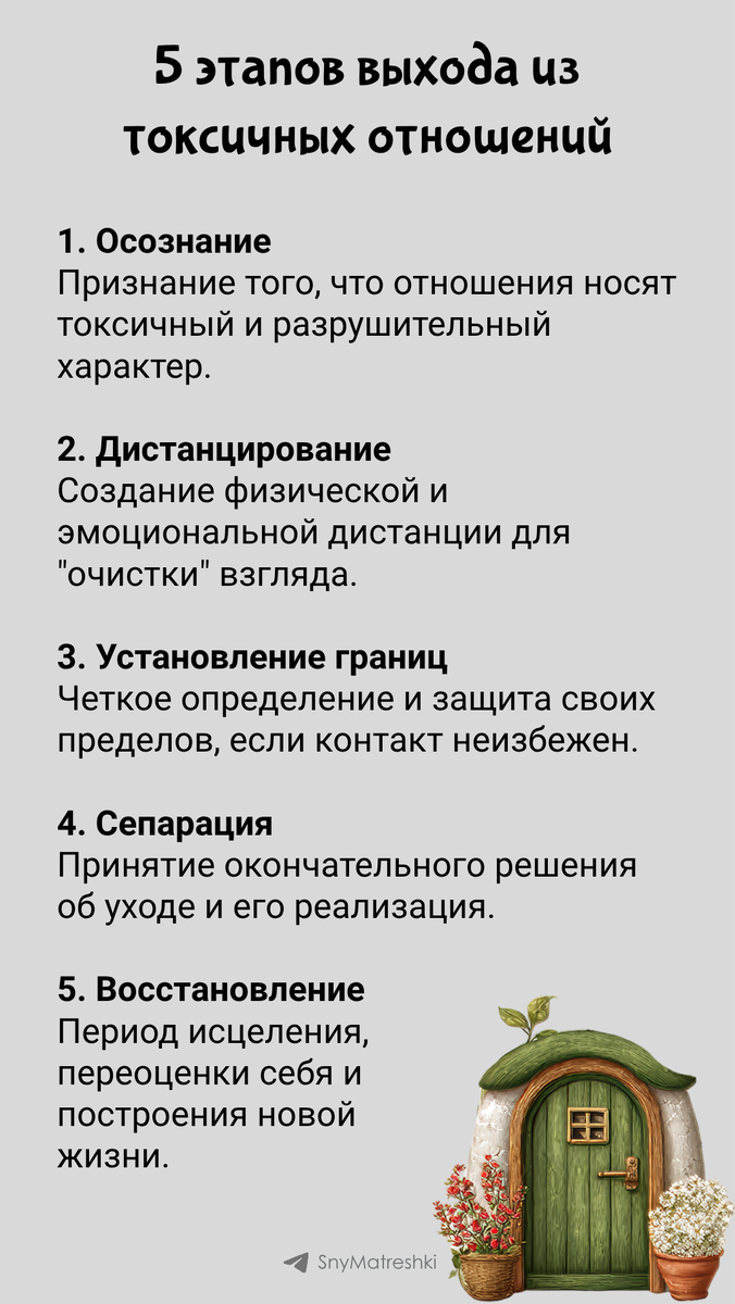 Нелинейный и часто болезненный путь от осознания проблемы до полного освобождения. Уйти — это процесс, а не единовременное событие. Дайте себе время и сострадание. Если вы в начале пути, сфокусируйтесь только на первом шаге — "Осознании". Ищите дополнительную информацию и поддержку. Поддержать автора Александра Бóгдан,