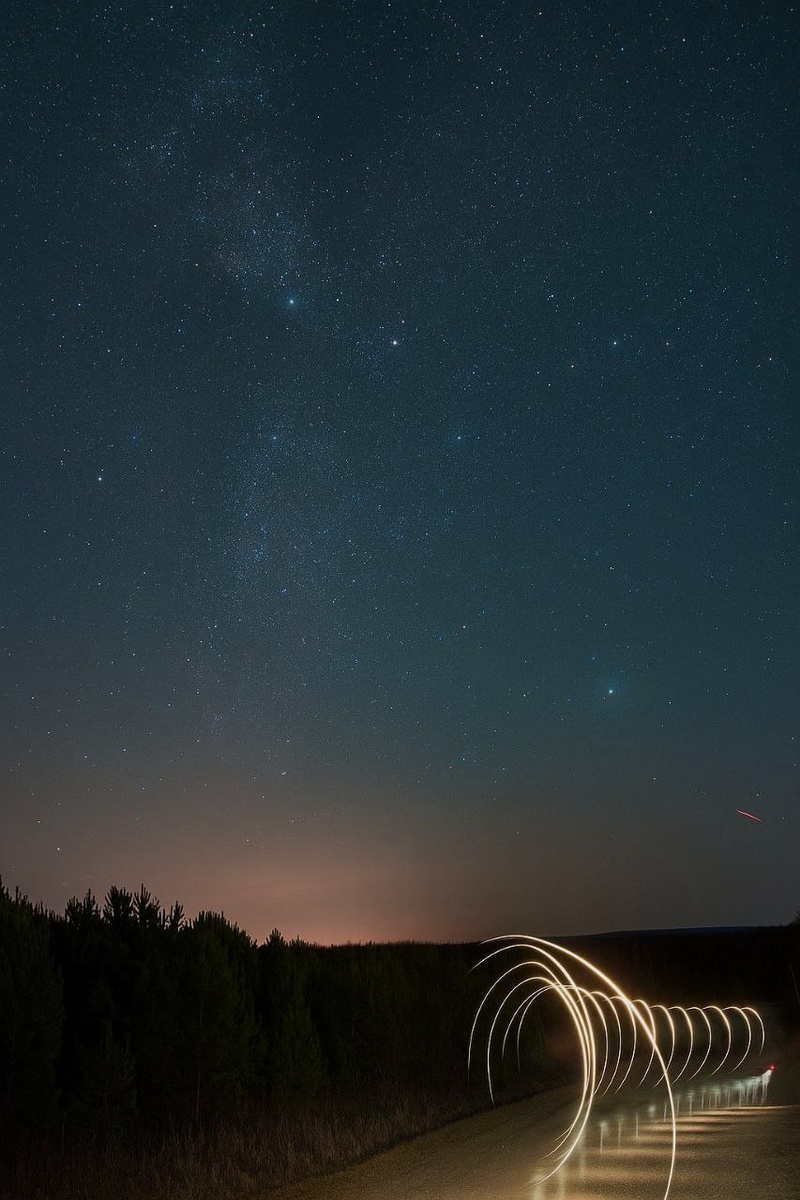 🌙 Как получились эти световые кольца? И да, это Екатеринбург светится на горизонте — даже в 50 км от города! Секрет не в фотошопе и не в магии объектива. Всё проще и интереснее! Пока камера ловила свет звёзд на долгой выдержке, я вручную «рисовал» эти кольца фонариком на телефоне в полной темноте. Каждое кольцо — это траектория движения света за несколько секунд. А вот главная магия длинной выдержки: она увидела то, что не видно глазу — свечение Екатеринбурга за десятки километров!