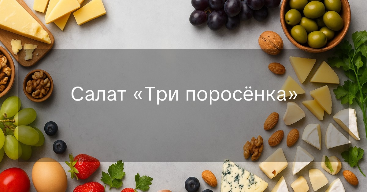 Салат «Три поросёнка» — это лёгкое и вкусное блюдо, которое идеально подойдёт как для праздников, так и для будней. Этот салат приятно удивит как детей, так и взрослых своим свежим вкусом и веселым оформлением. Кешью — 50 г Куриное филе — 1 шт. Лук репчатый — 2 шт. Масло подсолнечное нерафинированное — 1 ст. л. Огурцы — 1 шт. Сметана — 100 г Соль — 1 щепотка Шампиньоны свежие — 200 г Яйца куриные — 5 шт. Для начала подготовьте все ингредиенты: куриное филе, шампиньоны, кешью, яйца, сметану (или майонез) и огурец. Шаг 1: Отварите куриное филе с одним луком в подсоленной воде до готовности, примерно 25-30 минут. Шаг 2: Нарежьте шампиньоны и обжарьте их на сковороде с оставшимся луком на растительном масле до готовности около 10-12 минут. Шаг 3: Истолките орехи кешью и высыпьте их в тарелку. Шаг 4: Отварите два яйца, остудите их, нарежьте и добавьте к орехам. Шаг 5: Порежьте варёную курицу и положите её в тарелку. Шаг 6: Добавьте к салату обжаренные шампиньоны. Шаг 7: Положите зелень и на