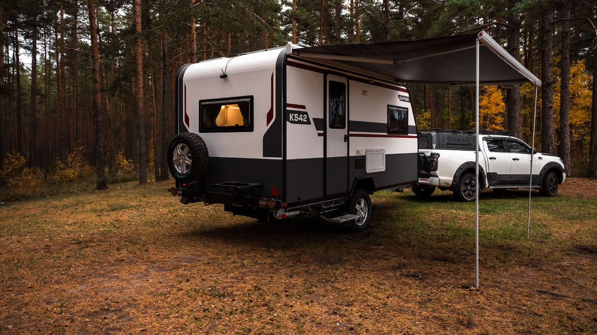 • Подвеска должна быть энергоёмкой (которая способна "поглощать" удары кочки, ямы - так караван не раскачивается слишком сильно, что снижает риски поломок крепежа и мебели), а колёса — с зимней резиной и off-road профилем.В прицепах KARSO регулируемая рычажно пневматическая подвеска рассчитана на внедорожье, то есть на грун, гравий, лесные и торфяные дороги и горные дороги, где удары сильнее, чем на асфальте.
