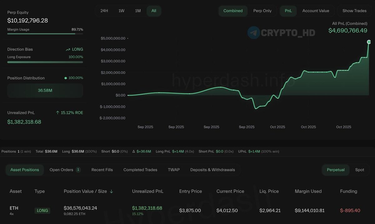 🤑 Топ-1 трейдер Hyperliquid «0x4e8d» с идеальной статистикой (100% успешных сделок) открыл лонг по #ETH с 4x плечом на $36,000,000+.