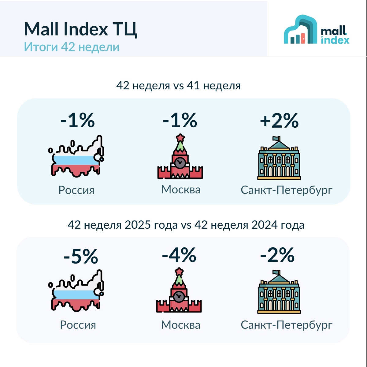 Mall Index TЦ, итоги 42 недели 🔻 42 неделя vs 41 неделя: -1% Россия -1% Москва +2% Санкт-Петербург 🔻 42 неделя 2025 года vs 42 неделя 2024 года -5% Россия -4% Москва -2% Санкт-Петербург
