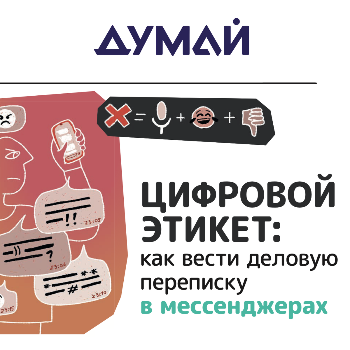 Хотите производить хорошее впечатление в рабочих чатах? Запомните эти правила: 1. 🗣️ Говорите сразу по делу После приветствия сразу излагайте суть. Не пишите просто «Привет» и не ждите ответа. 2. ⏰ Уважайте время Пишите в рабочее время. Используйте отложенную отправку для сообщений в нерабочие часы. 3. 🎯 Структурируйте мысли Одно четкое сообщение лучше десятка коротких. Делите на абзацы, соблюдайте грамотность. 4. 🚫 Без голосовых и смайлов Не отправляйте голосовые без разрешения. Смайлы и стикеры — только в дружеском общении. 5. 📝 Чек-лист перед отправкой: - Представились - Четко изложили суть - Проверили грамотность - Отправили в подходящее время Главное правило: Отправляйте только те сообщения, которые хотели бы получить сами! 📖 По материалам журнала «ДУМАЙ» №42, февраль 2023. 📚 Умный журнал. ДУМАЙ. Подпишись! www.dum.ai | vk.com/dumai_russia