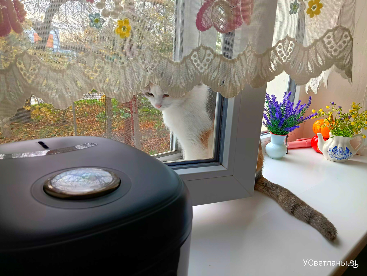 Проснувшись сегодня, я долго вспоминала какой сегодня день. Не могла вспомнить, пока не заглянула в свой телефон — Вторник. Это плохо, что я стала сбиваться со счёта дней недели. Ну, да ладно, главное все живы, здоровы. Умылась, почистила зубы переоделась, зашла на кухню: Машенька умница, она спокойно сидит и наслаждается свежим утренним воздухом в открытом окне. Молча, никого не трогая. В это время Дима поставил путассу на огонь, сейчас на запах сбегутся все: и Бельчик, и Васька, а там и Манечка учует и тоже прибежит. Машенька так хорошо сидела, а тут я со своим телефоном потревожила её утренний покой. А знаете, куда она постоянно смотрит? На порхающие листики, медленно падающие с деревьев. Она думает, что они живые, типа птички, воробушки, только эти породистые какие-то, но странно, что упав на землю, они больше не шевелятся. А ещё дождик капает и своими каплями сбивает их с каждого дерева. А на этом фото пробежала рыжая уличная собачка и она смотрит ей вслед. В общем, много интересн
