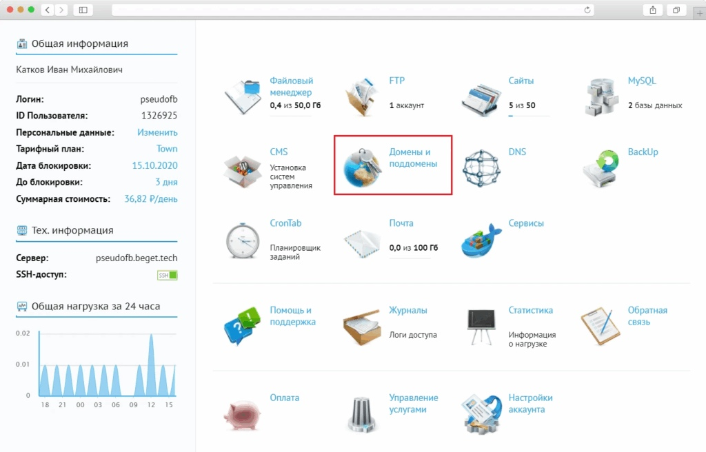 В панели управления сначала вам нужно пополнить счет, потом зайти в раздел Домены и поддомены и там уже зарегистрировать домен. Для этого понадобятся паспортные данные, анонимно купить домен нельзя. Но не беспокойтесь, ваши данные больше никто не увидит.