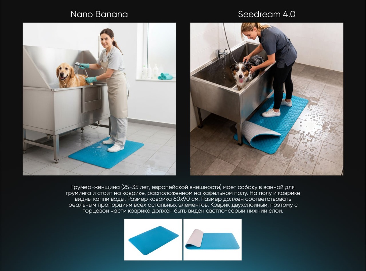 Когда меня спрашивают, почему Nano Banana, а не Seedream 4.0. Хочется спросить в ответ: "А вы пробовали в Seedream работать с товаром"? Да, крутая реалистичность. Да, размер изображения до 4K. Скорость тоже отличная и даже понимание промпта на хорошем уровне. Но товар часто сильно меняется. Данный проект делаем для Amazon. Товар: коврик для груминга. И как одно из применений — антифатига для специалиста по грумингу. Полный пакет контента и все на генерациях. Если интересно, то попозже поделюсь внутрянкой проекта: почему такая воронка, последовательность сборки контента, какие микро-решения были приняты при производстве контента и тд. В общем ставьте лайк если хотите продолжения.