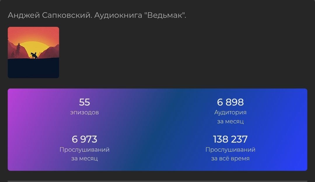 Статистики постЪ! Не буду углубляться в дебри всех книжков и проектов. По "Ведьмаку" на сегодняшний день всё просто. Эпизоды без изменений, а прослушивания растут. А вот с "In Genu" ещё рано снимать показания. Там всё собирается и пока. Так что, подкидывайте родственникам, знакомым, друзьям, распространяйте литературную культуру. Мне кажется, что это неплохой повод привить любовь к чтению. https://music.yandex.ru/album/37870922?utm_medium=copy_link&ref_id=9dd6e889-6e0c-41f4-b943-1b609a30b6a1