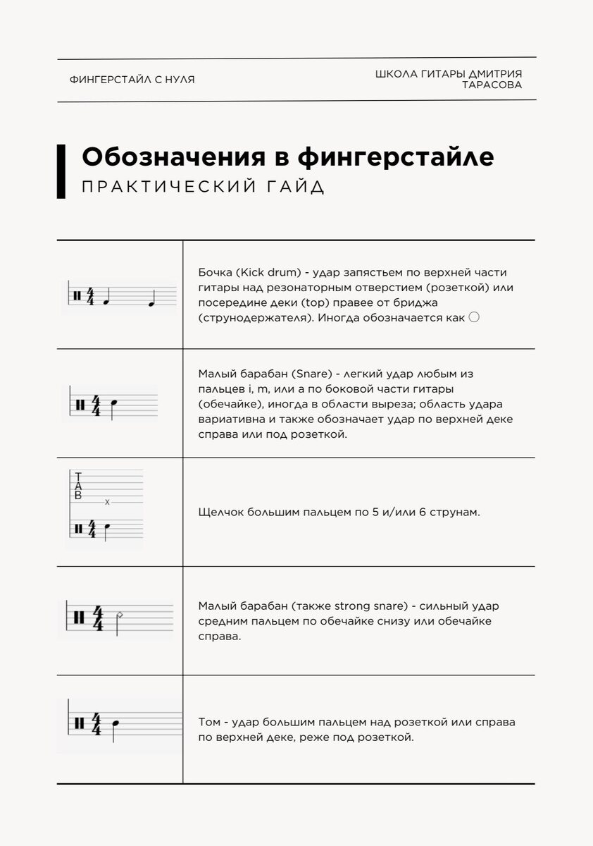 Список со временем будет пополняться, потому что у многих гитаристов есть свои собственные обозначения. Я постараюсь все систематизировать и описывать максимально доступным языком. Поэтому, если вам встретятся какие-то моменты, не отраженные в этом гайде, то присылайте ниже в комментариях примеры и описание. Удачи в освоении 🍀 Ссылка на скачивание в моем телеграмм-канале #фингерстайл@fingerstyle_s_nulya #теория@fingerstyle_s_nulya #акустика@fingerstyle_s_nulya
