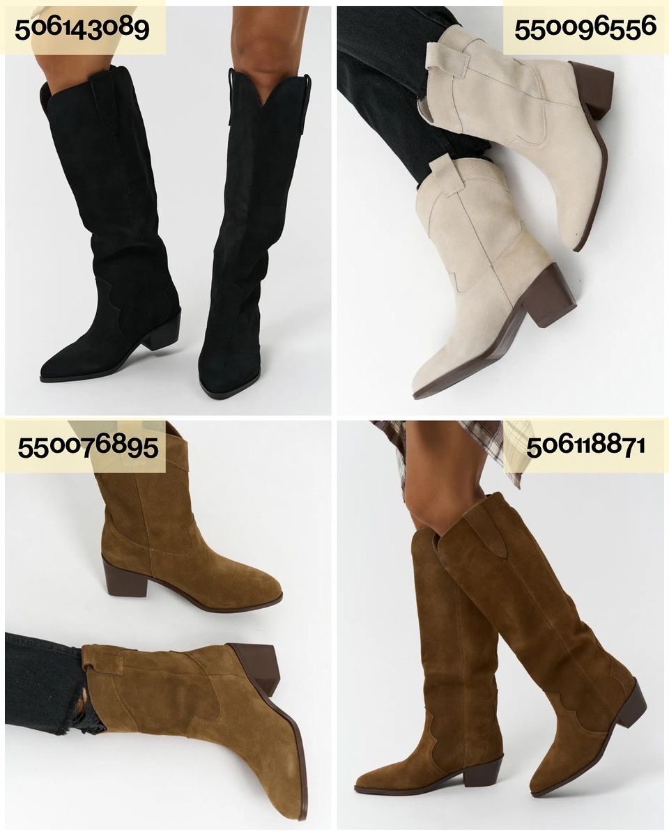 Коллаж 1. Западный силуэт: замша, устойчивый каблук, мягкие линии