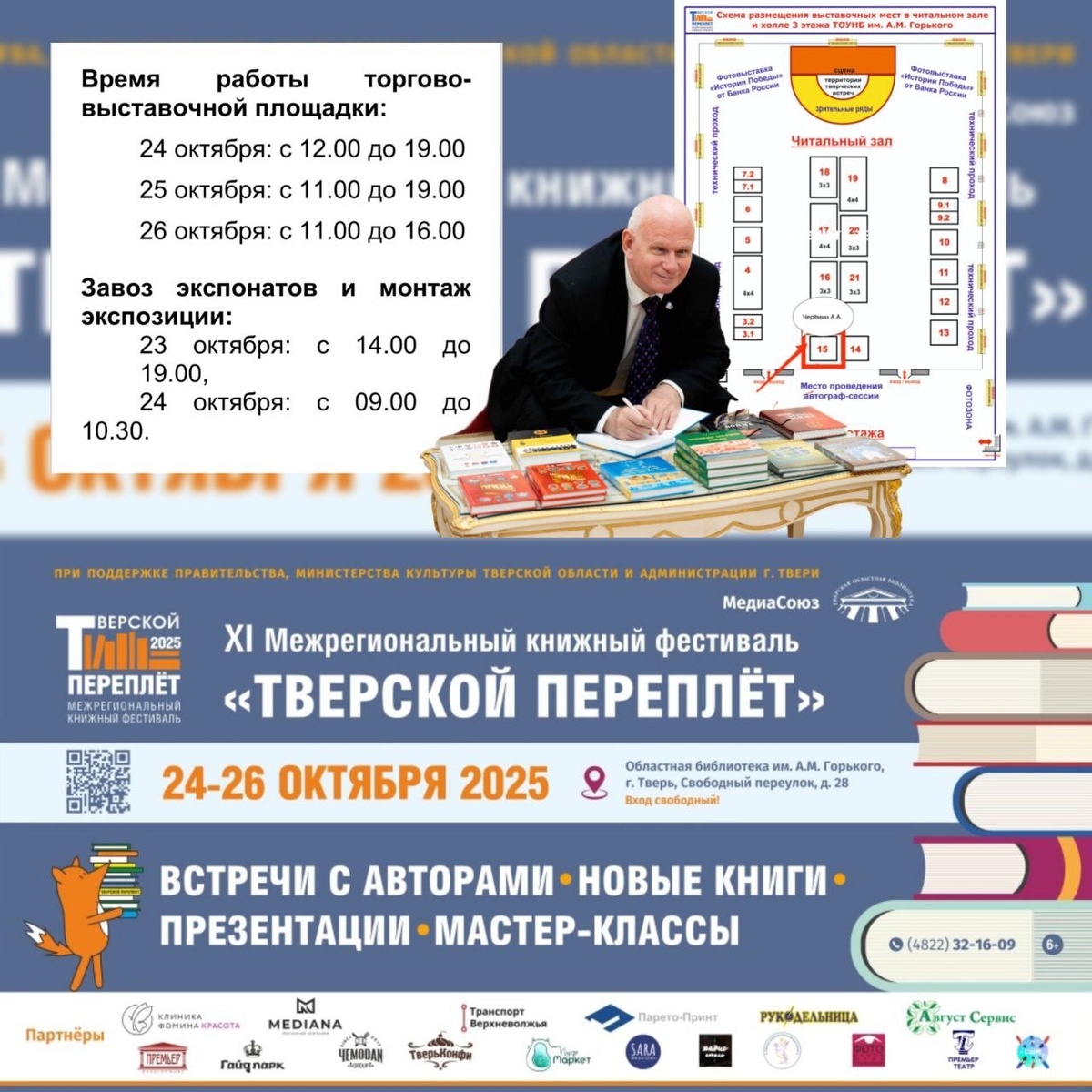 г. Тверь! Место встречи в городе Твери изменить нелья! Дорогие друзья, приглашаю вас посетить мой стенд 15 на XI книжном фестивале «Тверской переплет» г. Тверь, Свободный переулок, д. 28 Областная Библиотека им. А.М. Горького. Время работы: 24 октября с 12:00 до 19:00 25 октября с 11:00 до 19:00 26 октября с 11:00 до 16:00 Автограф от автора в подарок! Новинки: «Академик, историк, археолог Борис Александрович Рыбаков» «Астраханский Улус - ханство (13-16 века)». Автограф в подарок, всегда ваш историк- писатель Черёмин Александр Александрович! До встречи дорогие друзья!