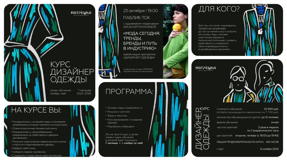 Старт программы запланирован на 6 ноября. В течение семи месяцев (с ноября по май) участники курса пройдут полный путь создания собственной коллекции одежды. 👗Программа разработана специально для подростков 12–17 лет, мечтающих реализовать себя в мире моды. Особое внимание уделяется развитию творческого мышления, формированию уникального стиля и поиску оригинальных решений. Итогом обучения станет создание собственной мини-коллекции и её презентация на выпускном показе. 👩💻 В программе курса: Специальное предложение: 23 октября в пространстве «Матрёшка» состоится бесплатная встреча с преподавателем. Это отличная возможность познакомиться с программой курса и задать все интересующие вопросы. Расписание занятий: ⏰ Успейте записаться! Регистрация открыта по ссылке: vk.cc/cQ7D5p Дедлайн подачи заявок: 27 октября. Осталось всего 7 дней! Читайте подробнее: https://provrn36.ru/kursy-dizajner-odezhdy/