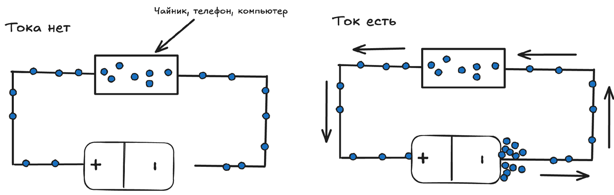 Мы уже знаем, что электроны начинают дружно двигаться, когда есть разница зарядов: минус отталкивает, плюс притягивает. Но откуда берутся эти «плюсы» и «минусы» в проводах компьютера? Чтобы запустить поток электронов, нужна «машина», которая создаёт и поддерживает эту разницу зарядов. Эту роль выполняет источник электричества. Самый простой источник — батарейка. Внутри неё идёт химическая реакция, которая разделяет заряды: на одном конце накапливается избыток электронов (минус), на другом — их нехватка (плюс). Получается, что один конец хочет «отдать» электроны, а другой «получить». Если соединить концы батарейки проводником (например, медным проводом), электроны устремятся от минуса к плюсу, и в проводе появится ток. Давайте рассмотрим иллюстрацию. На ней изображена батарейка и через провода подключен какой-то предмет, который работает от электричества. Свободные электроны существуют везде: и в проводе и в электро-п