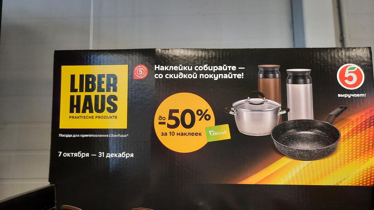 Приветствую всех, в Пятёрочке акция с 7 октября до 31 декабря 2025 года. Покажу вам витрину с посудой Liberhaus . Дополнительные электронные наклейки можно получить за покупку товаров-партнеров акции. Кухонные аксессуары Liberhaus в ассортименте, розничная цена 399 рублей. Крышка мультиразмерная Liberhaus стеклянная с силиконовым ободом универсальная. Розничная цена 699 рублей. Стекло термостойкое. Подходит для всех типов посуды диаметром 22, 24, 26 см. Можно мыть в посудомоечной машине. Идеально подходит для ежедневного приготовления любых блюд. Не царапает покрытие, можно использовать в духовке для 230 °С. Сковорода Liberhaus из литого алюминия с антипригарным покрытием. Диаметр 22 см. Подходит для всех типов плит, кроме индукционных. Розничная цена 1699 рублей. За 10 наклеек цена 1399 рублей. С сервисом Пакет цена 1199 рублей. Идеально подходит для ежедневного приготовления любых блюд. Еда на таком покрытии практически не пригорает. Покрытие позволяет не добавлять мас