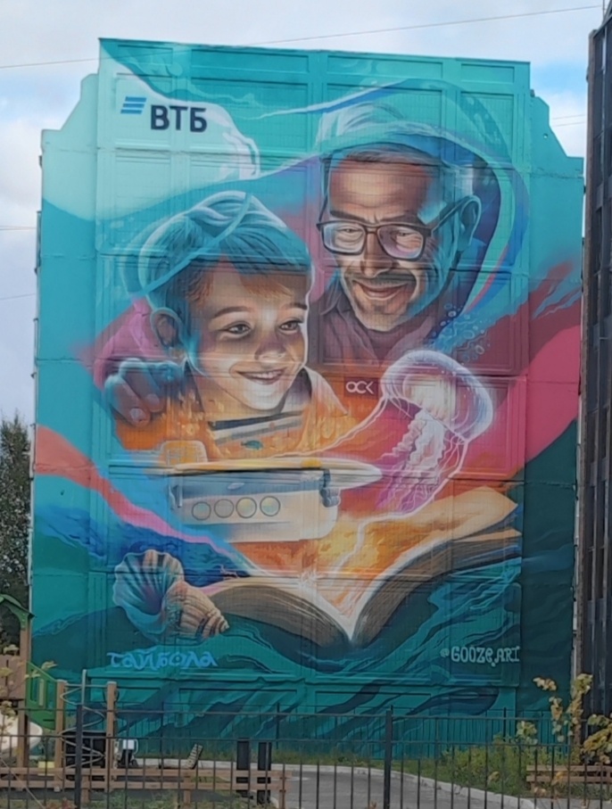 Продолжаю сбор показателей городской живописи: торцы Северодвинска не сдаются — они говорят, пугают скуку. Фото 1. Мурал "Мечты" — Архангельское шоссе, 85. На стене — корабел и мальчик, который читает книгу о дальних морях. Внизу — первая отечественная экскурсионная подводная лодка "Нептун", построенная на Севмаше в 1991 году. Получается, что тут и детская мечта, и исторический подводный экскурсовод в одном флаконе. Фото 2. Мурал "Облачность" — Лебедева, 19. Возможно, старожил северных граффити: в октябре 2014 за четыре дня город сделали чуть ярче петербургские ребята Наташа Флокси и Паша Пиксель. Работали быстро и аккуратно — оставили после себя облака (и хорошее настроение). Фото 3. Приморский бульвар, 38 (2021). На планете «Ягры» высадился Маленький прину. Пейзаж с соснами, дюнами и морем по эскизу Алёны Соломатиной, а роспись воплотил стрит‑артист Юлья Мартынов. Смысл картины — «Приведи в порядок свою планету» — и начни с собственной террасы. Фото 4–8. Большая Ягринская