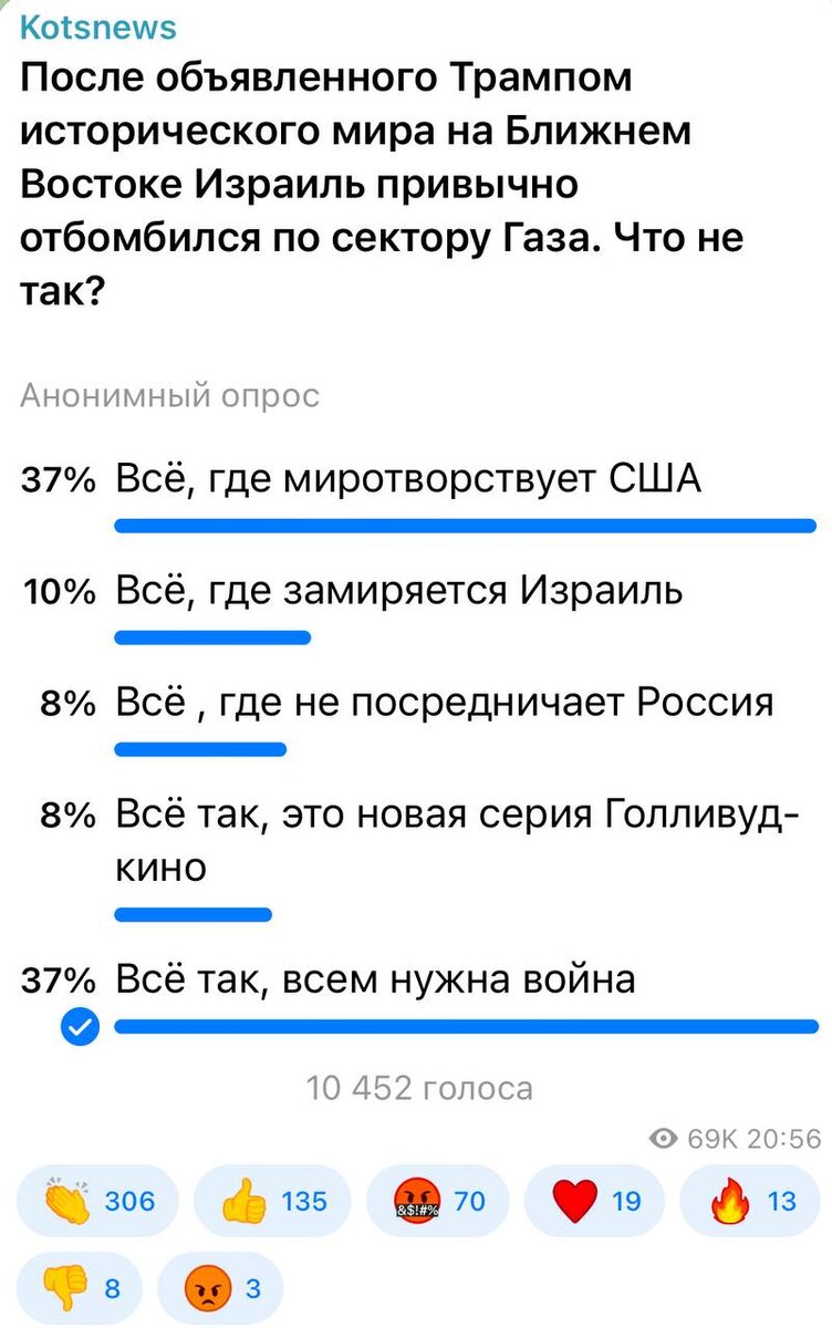 ⚡️⚡️⚡️ 37 процентов подписчиков уверены, что война - естественный итог миротворчества США