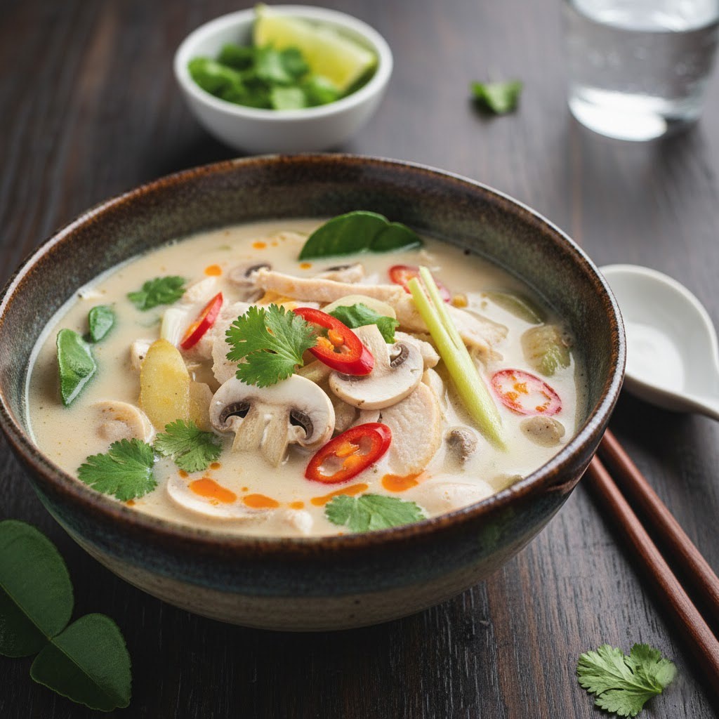 Том Кха — это один из самых любимых тайских супов, известный своим богатым, ароматным и кремовым вкусом. Он менее острый, чем Том Ям, и идеально подходит для тех, кто любит кокосовое молоко и пряные травы.