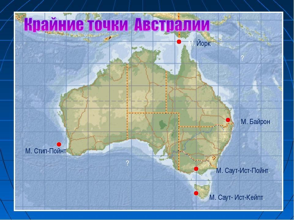 Вся территория Австралии представляет собой основную часть единственного в мире государства, занимающего целый материк с одноимённым названием. Простирается с запада на восток почти на 4 000 км, а с севера на юг — на 3 860 км. Береговая линия слабо изрезана. Материк омывается морями двух океанов — Тихого и Индийского. Вдоль северо-восточного побережья Австралии более чем на 2 500 км протянулся самый большой в мире коралловый риф — Большой Барьерный риф.