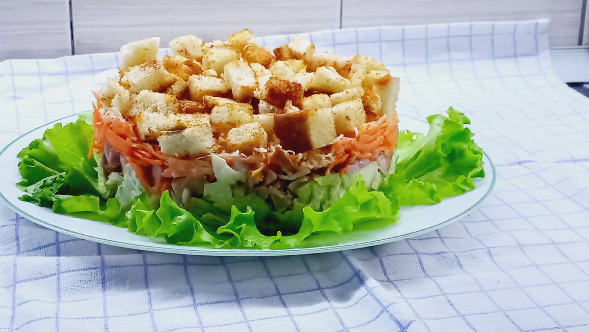 На этом этапе пришла очередь сухариков. Выложите их последним слоем, чтобы они оставались хрустящими и не размокли от заправки. Жареные сухарики добавляют завершающий штрих и прекрасно дополняют текстуру и вкус.