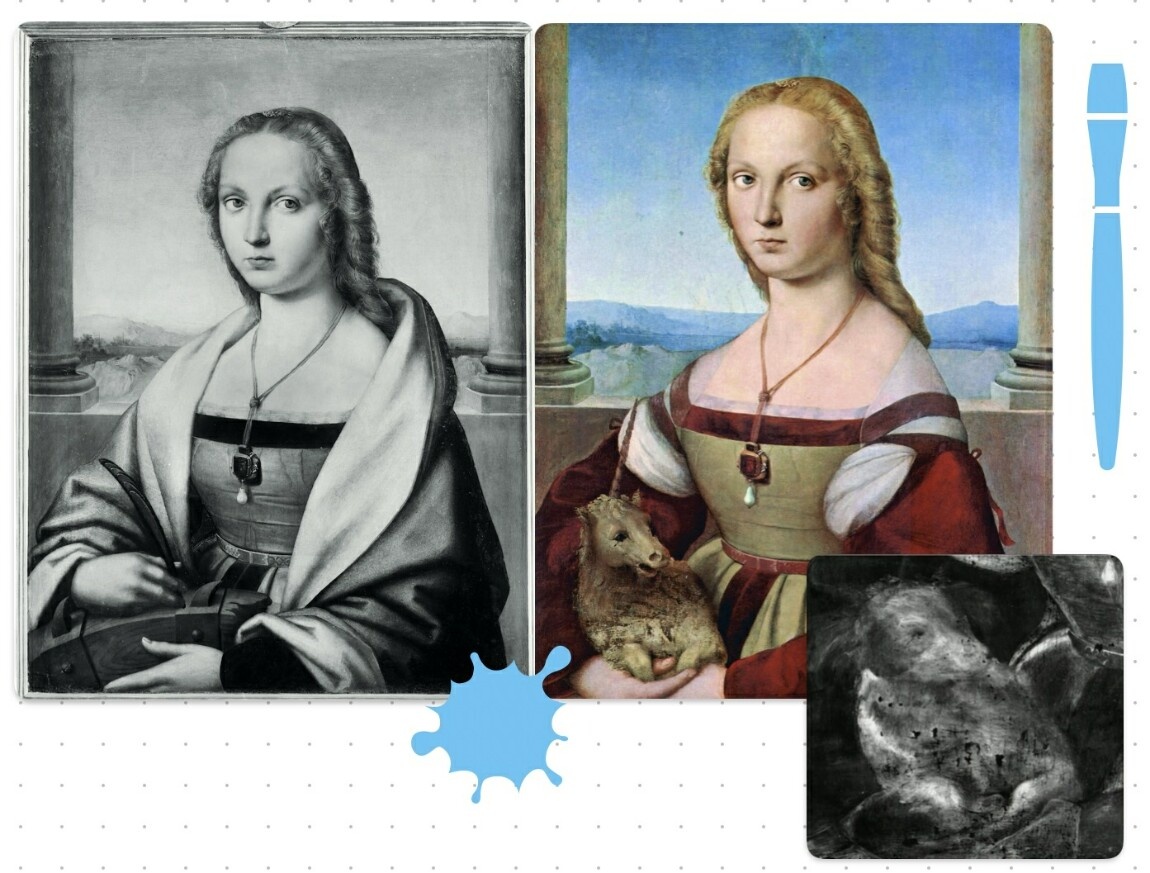 Всё изменилось в 1936 году, когда реставраторы сняли поздние слои краски и обнаружили подлинный образ — с открытыми плечами, вуалью и крошечным единорогом. А рентген позже показал ещё один сюрприз: под единорогом когда‑то была изображена маленькая собачка