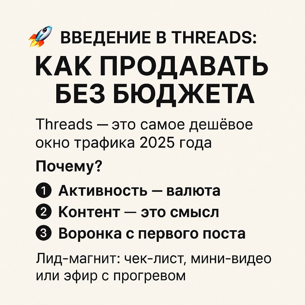 🚀 Введение в Threads: как продавать без бюджета Threads — это не просто новая площадка. Это самое дешёвое окно трафика 2025 года. Пока за заявку в Телеграм платят 500–1000 ₽, в Threads заявки стоят 0 рублей. Почему? 👉 Алгоритм пока раздаёт охваты всем, кто пишет и общается. Не нужно быть блогером. Достаточно быть живым и системным. 🔹 3 правила, чтобы продавать из Threads 1. Активность — валюта. Не лайки, а комментарии. 10 смысловых комментариев = 1 пост по охвату. 2. Контент — это смысл. Пиши то, что прожил. Истории, выводы, инсайты — вот что вызывает доверие. 3. Воронка начинается с первого поста. Каждая ветка должна вести к твоему Telegram или продукту. Threads → Коммент → Telegram → Заявка → Продажа. 💡 Про лид-магнит Лид-магнит — это твоя «дверь» в воронку. Это может быть чек-лист, мини-видео, гайд, движ или эфир. Главное — не просто дать пользу, а разогреть интерес к следующему шагу (Tripwire или консультации). Сейчас время зайти в Threads. Пока конкуренции почти нет,