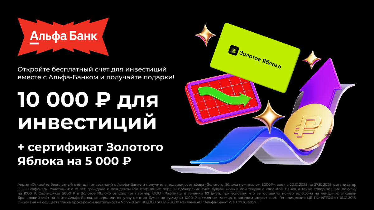 Альфа-инвестиции: сертификат на 5000 рублей в Золотое Яблоко за открытие брокерского счета. Акция до 27.10