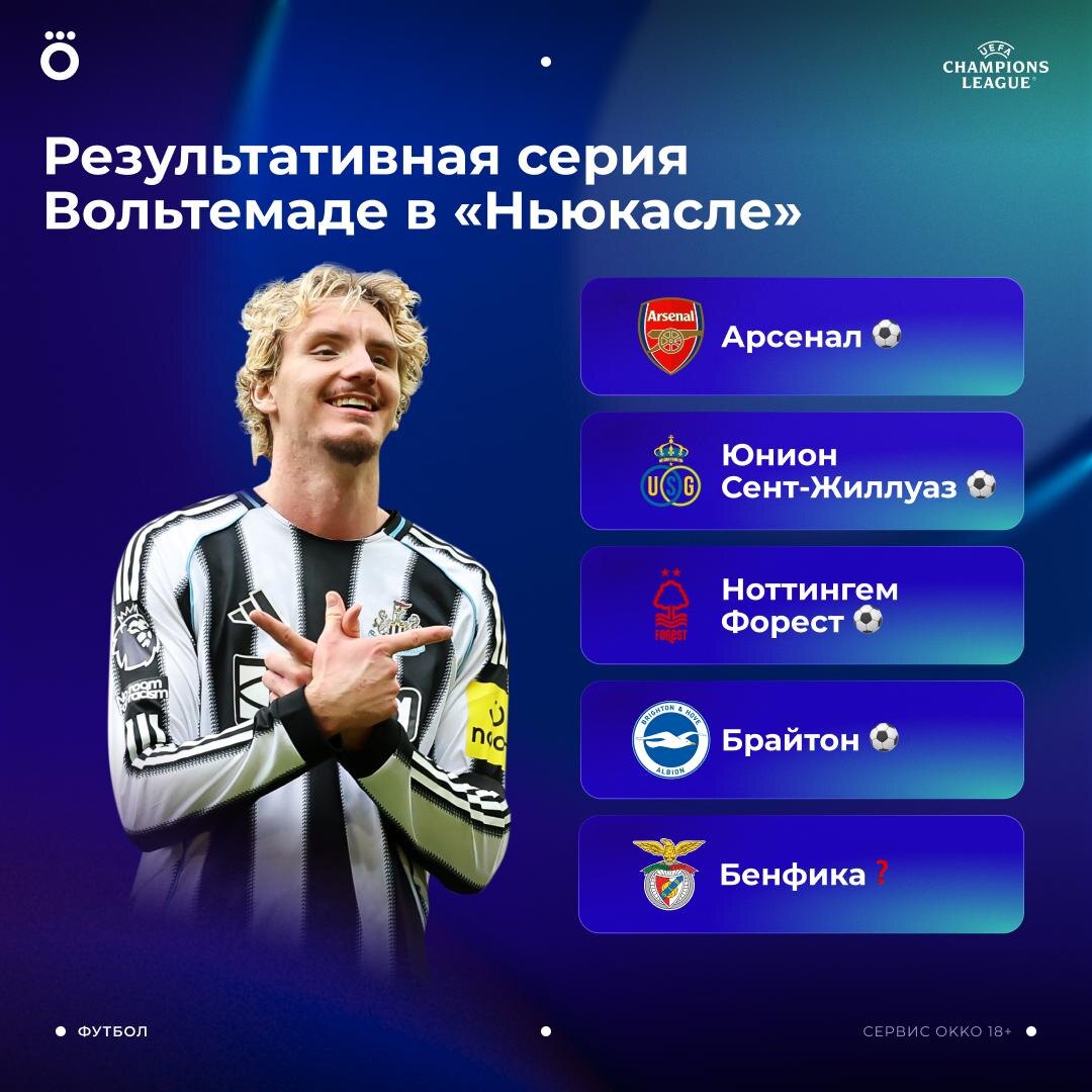 Трансфер Вольтемаде не воспринимали всерьез. А он взял и заменил Исака в «Ньюкасле» ⚽️ Результативная серия Ника достигла четырех матчей. Забьет сегодня «Бенфике»? 👍 / 👎