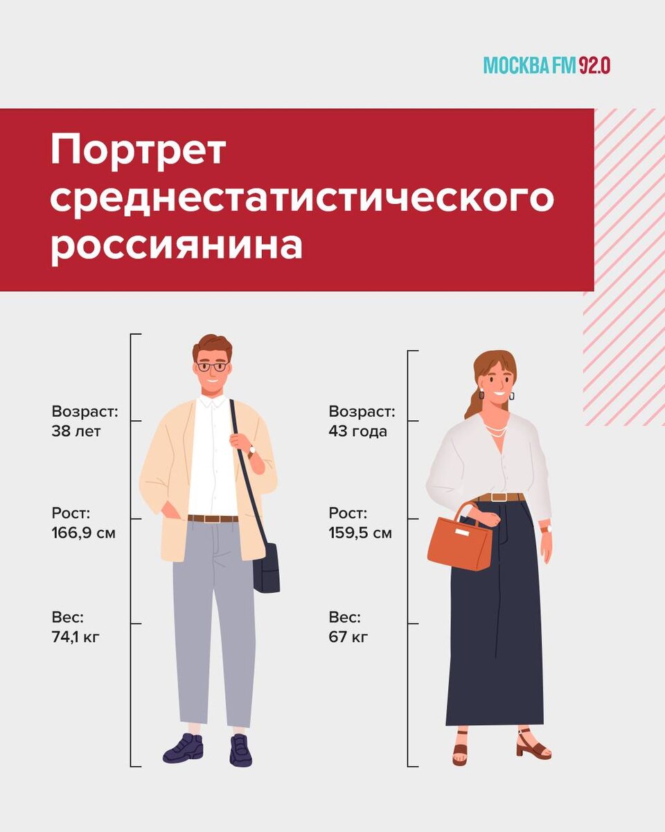 🤔 Вот они какие, россияне… Ну, среднестатистические! Портрет составил Росстат: тут выражены средние показатели внешности, доходов и хобби граждан. Смотрите карточки выше и пишите в комментарии, что оказалось неожиданностью ⬆️ 📌 Подписаться на Москва FM / Наш чат-бот / Мы в MAX