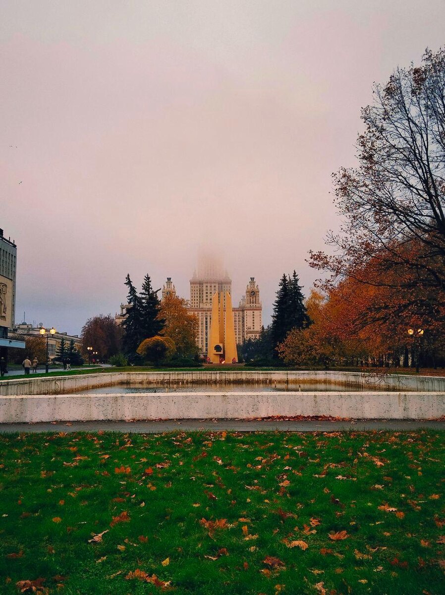 В ночь на среду объявлено погодное предупреждение: местами видимость падает до нескольких сотен метров. Утром МГУ частично «исчез» в дымке — туман плотный.