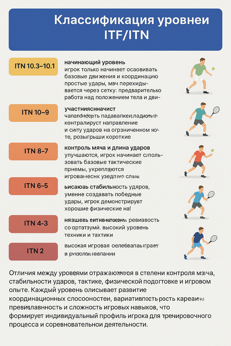 - ITN 6–5: игрок умеет эффективно подавать и возвращать мяч, участвует в розыгрышах средней длины; развиты навыки выхода к сетке; тактика игры становится более осознанной и разнообразной.