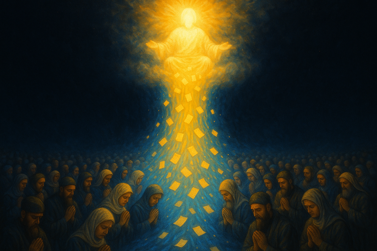 В храме происходит удивительное: сотни записок, тысячи имён, миллионы молитв соединяются в единый поток. Он поднимается к небу, превращаясь в золотое сияние — в общую энергию любви и прошения, которая становится видимой лишь духовным взором. Так, как показано на картине: Бог словно вбирает в Себя эту реку света. Ему не нужно различать — где молитва «твоя», где «чужая». Весь этот поток — единое дыхание веры, в котором каждая душа имеет свой голос.