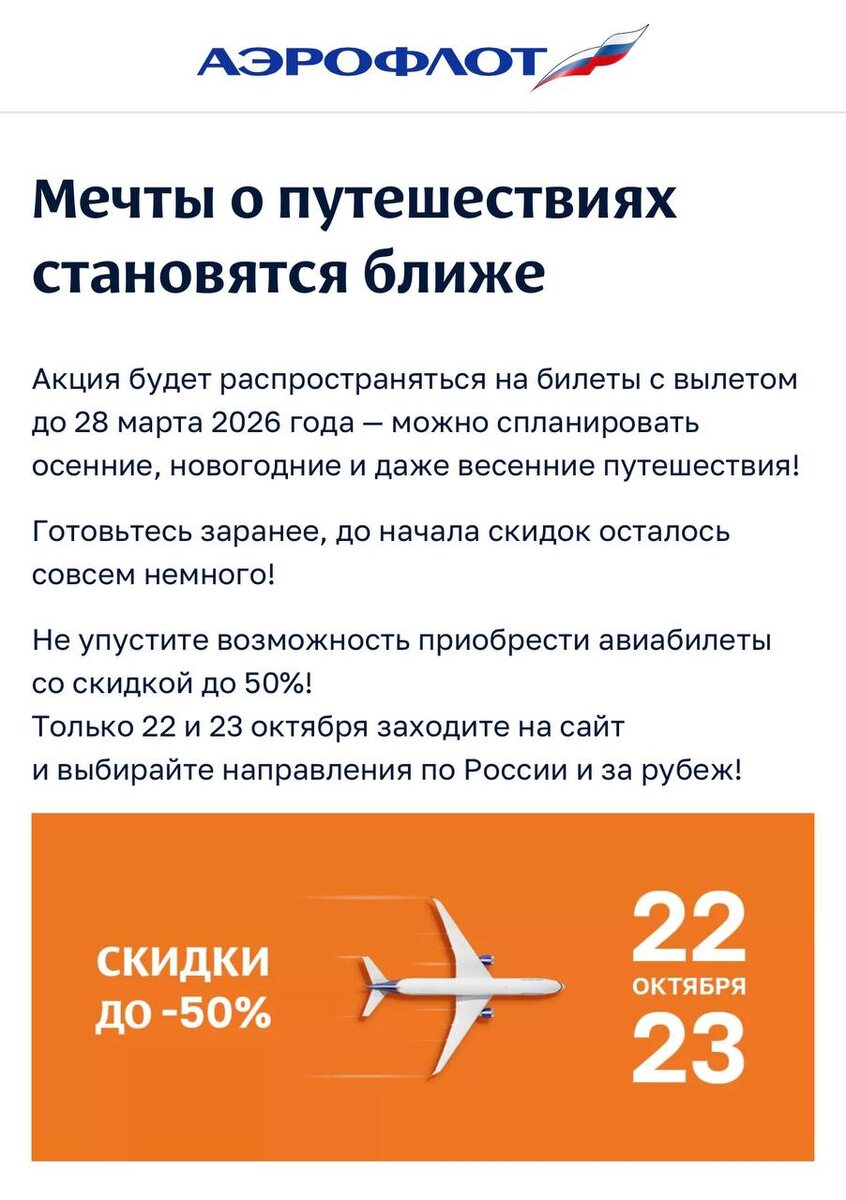 ❗❗ 🎉 Через пару часов стартует масштабная распродажа авиабилетов от Аэрофлота — и это именно тот случай, когда не стоит откладывать на потом, даже на утро! 📅 22 и 23 октября — всего два дня! Скидки до 50% на рейсы по России и за границу. 🌍 В списке уже мелькают: Мальдивы, Сейшелы, Дубай, Баку — и это только начало! 🛫 Период путешествий: с 26 октября 2025 по 28 марта 2026 — как раз чтобы успеть и на море, и в горы, и куда хотите 😅 ⚡️ Самые дешёвые билеты разлетаются за часы, поэтому: — будь на сайте ровно в 00:00, — заранее авторизуйся на сайте Аэрофлота, — сохрани данные всех пассажиров (паспорт, дата рождения, телефон), — приготовь карту — и действуй быстро. 💡 Лайфхак: Зайди на Aviasales, в поле назначения введи «Куда угодно», а в датах — период акции. Найдёшь подходящее — переходи на сайт Аэрофлота, там может быть дешевле, чем у агрегатора. 🎯 Главное — не тормози. Как только нашёл нужный билет — бронируй. Бронь держится ~50 минут, даже без оплаты. Увидел вариант получше —