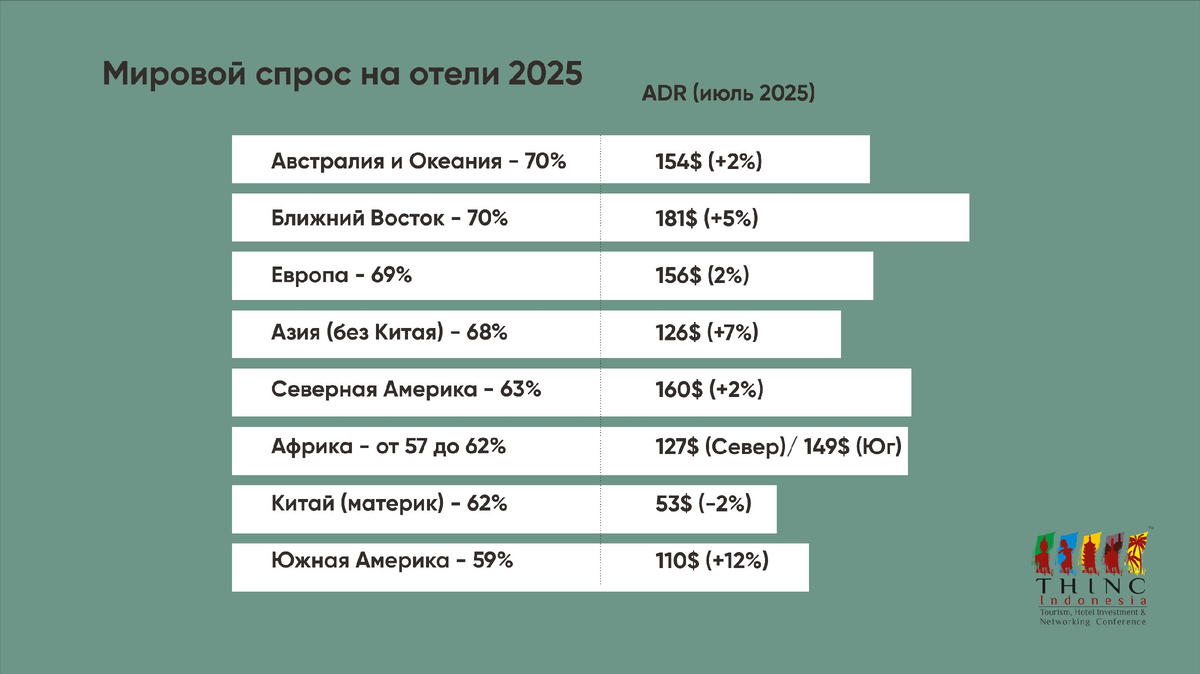 Основные тезисы после конференции THINC INDONESIA 2025 (главная отельная конференция региона) Глобальная картина спроса на мировом рынке: лидерами по загрузке номеров (около 70%) являются регионы Австралии и Океании, Ближнего Востока и Европы, Азия без Китая - 68% Средняя стоимость номера за сутки проживания (ADR) больше всего выросла в Южной Америке (+12%) и Азии (без Китая, +7%) Ключевые тренды Индонезии Рынок переходит в фазу стабилизации после периода активного роста Снижается количество новых номеров на рынке (продолжающийся тренд с 2021 года). В пайплайне находится 30-32 тыс. номеров Снижается активность нового строительства в районах Джимбаран и Убуд Замедление темпов роста цен номера за ночь во всех сегментах: • в премиум сегменте зафиксирован рост +13% с января 2024 г., с августа уже +6% • в среднем сегменте +12% с января 2024 г. и +7% с августа • в эконом сегменте +10% с января 2024 г. и +4% с августа Средняя стоимость суток пребывания $100-120 в Сануре и $250-30